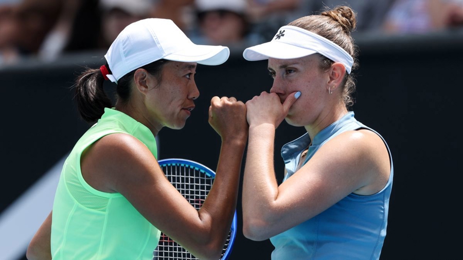 新华社照片,墨尔本(澳大利亚),2026年1月28日\n 1月28日,张帅(左)/梅尔滕斯在比赛中交流。\n 当地时间1月28日,在墨尔本进行的2026年澳大利亚网球公开赛女双四分之一决赛中,张帅(中国)/梅尔滕斯(比利时)2比1战胜吴芳娴(中国台北)/穗积绘莉(日本),晋级四强。\n 新华社记者 马平 摄