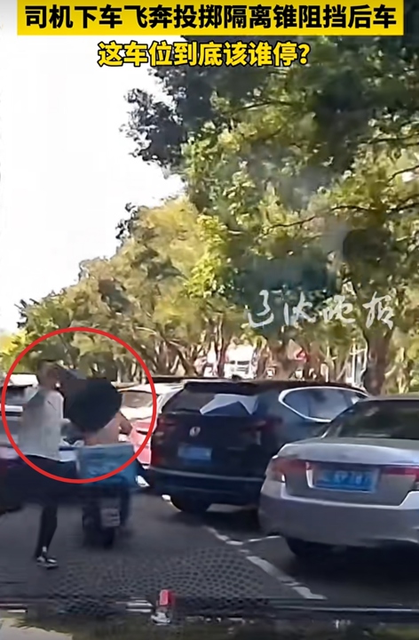 有人飞奔投掷隔离锥阻挡后车