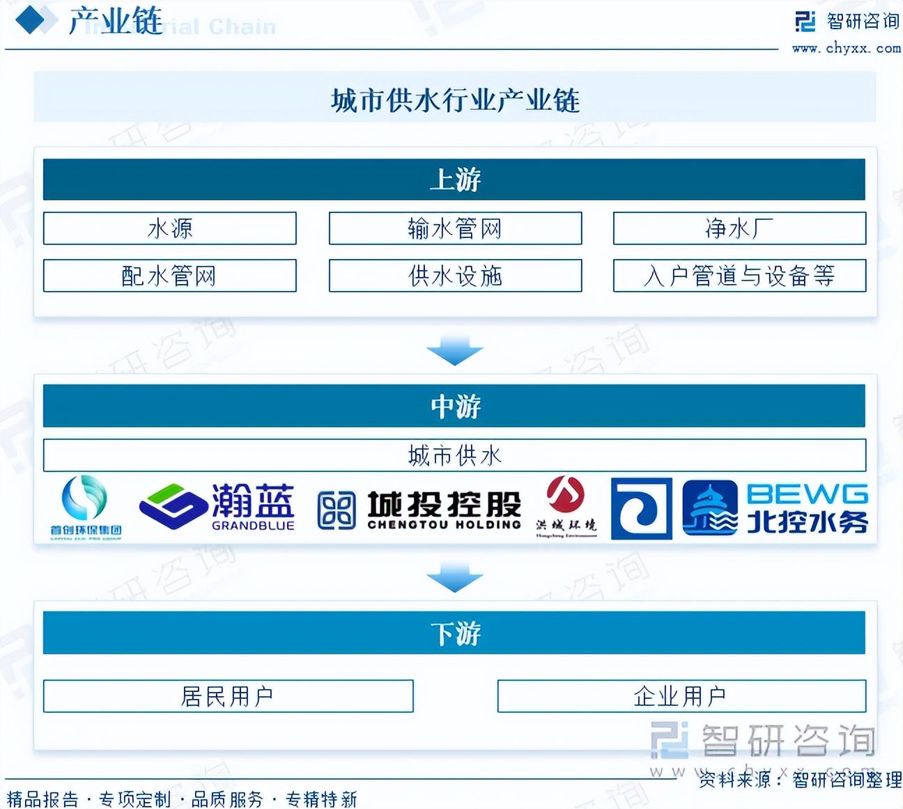 城市给水产业链上游包括水源、输水管网、清水厂、配水管网、给水设施、入户管说念与开荒等。产业链中游为城市给水设施诞生、工程施工和神态运营珍藏。产业链下流为末端商场,包括住户用户和企业用户。