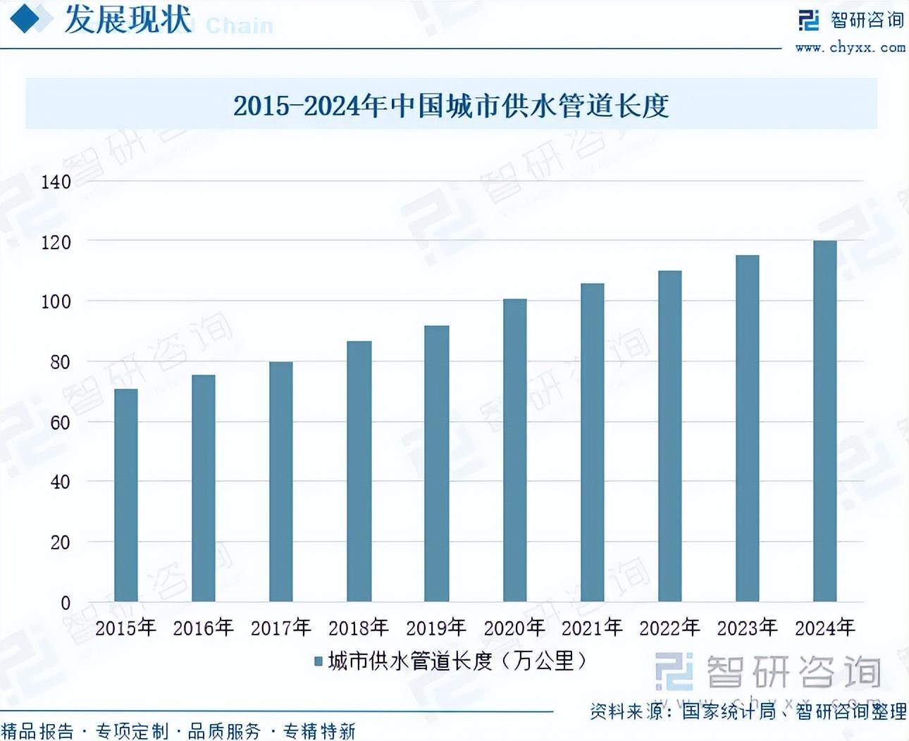 城市给水管说念长度是指城市内给水管说念的总长度,它是算计一个城市给水系统畛域和智商的进击标的。城市给水管说念长度的增长,意味着城市的延迟和发展。连年来,中国城市给水管说念长度举座呈现逐年增长的态势。数据统计,中国城市给水管说念长度从2015年的71.02万公里增长至2024年的119.95万公里,年复合增长率为6%。凭据《国度水网诞生狡计摘录》,条目加速构建水网诞生,诞生主干输排水通说念,以前城市给水管网畛域将连接增长。