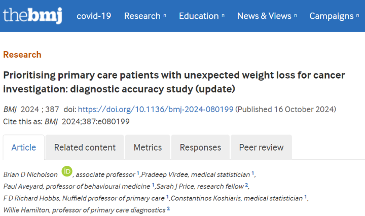 [1] Nicholson BD, Virdee P, Aveyard P, et al. Prioritising primary care patients with unexpected weight loss for cancer investigation: diagnostic accuracy study (update). BMJ. 2024 Oct 16;387:e080199. PMID: 39414353; PMCID: PMC11480917.