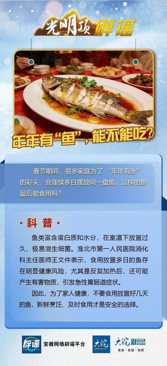 大皖新闻讯过年期间,好多家庭的餐桌上齐会有一盘鱼。在好多所在的民风习惯中,这盘鱼会好多天齐出当今餐桌上,以讨得“年年多余”好彩头。不外,这盘放了好多天的鱼其后到那里去了呢?有网民暗示,很大可能会被习惯于检朴的家中老东说念主吃了。那么,这么流畅扬弃多日的鱼,到底能不行吃呢?淮北市第一东说念主民病院消化科主任医生王文献暗示,扬弃多日的鱼可能会繁殖细菌导致变质,若是食用可能导致健康风险。