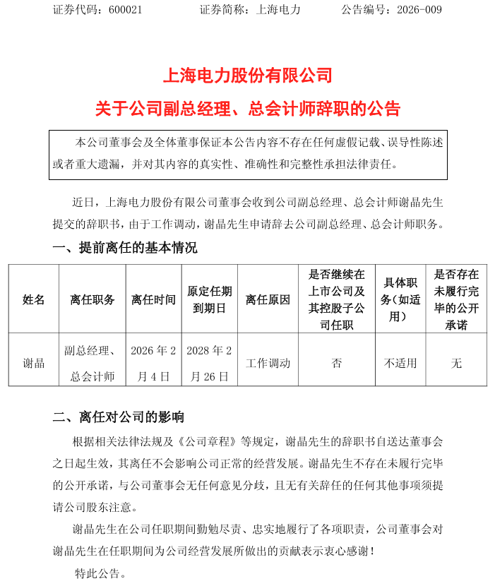 近日,上海电力董事会收到副总司理、总司帐师谢晶先生的书面下野敷陈,由于责任调养,谢晶先生肯求辞去公司副总司理、总司帐师职务。原定任期至2028年2月,提前2年离任。