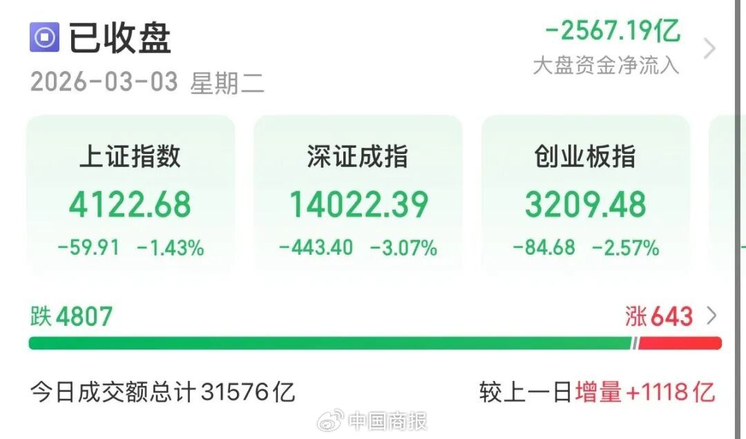 中国商报(记者 王彤旭)3月3日,A股三大指数集体下落。收尾收盘,上证指数跌1.43%,深成指跌3.07%,创业板指跌2.57%,北证50指数跌4.11%。沪深京三市成交31576亿元,较上一日增量1118亿元,三市超4800只个股下落。