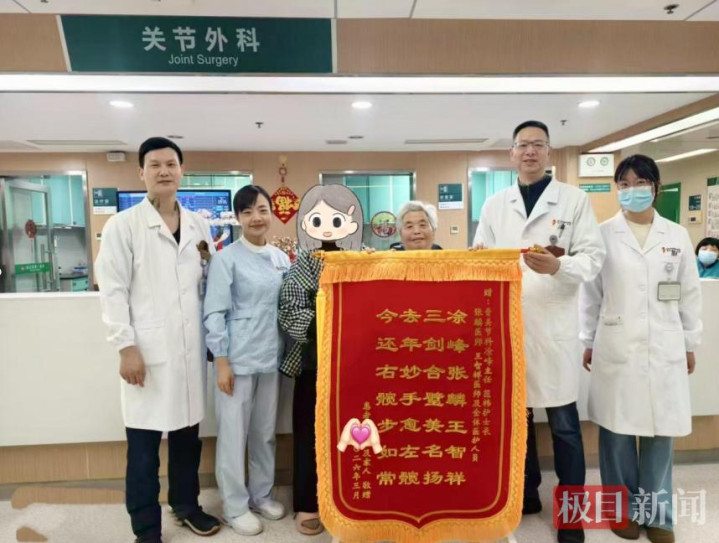近日,78岁的江婆婆将一面锦旗送到武汉市第一病院(武汉市中西医勾通病院)骨舛错科医护东说念主员手中,上头印有自创的打油诗,说念出了老东说念主从抗击手术到重获行走解放的心路历程。